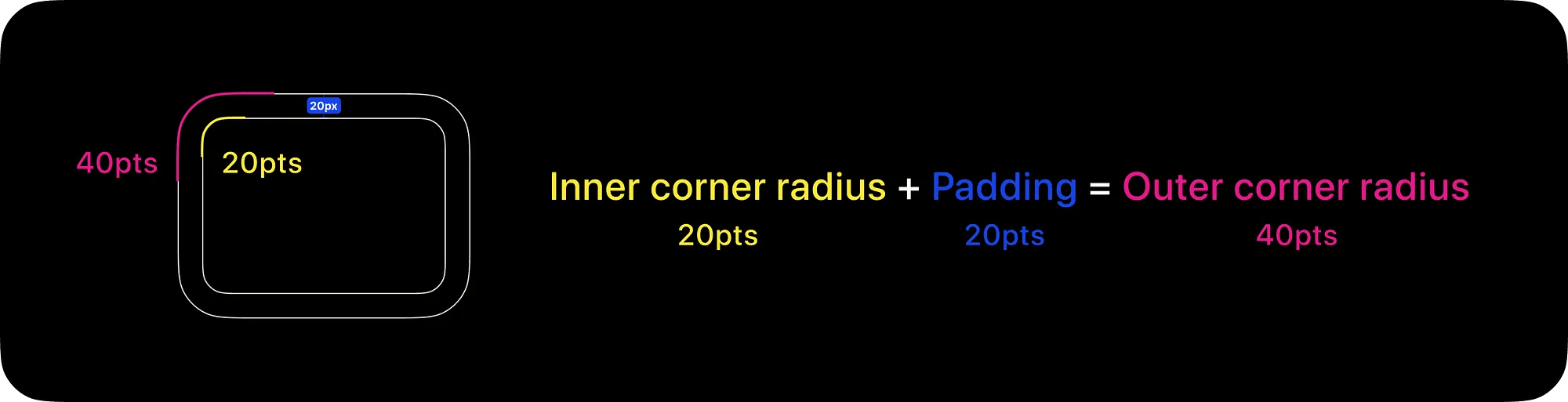 11. Nested elements should have relative corner radius and padding : It keeps them concentric with each other and it helps feel like they belong together. Use the formula below to calculate the corner radiuses.